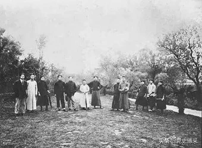 ◆1918年4月,毛泽东同蔡和森等在长沙发起成立新民学会,聚集了一批具有爱国革新思想的进步青年。图为1920年5月8日,毛泽东(左七)与新民学会部分会员在上海半淞园合影。