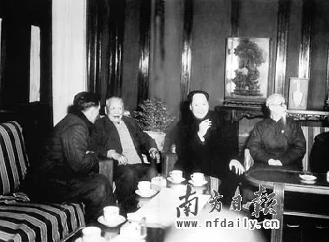 ▲1950年,毛泽东与司徒美堂(左二)等爱国人士在一起。