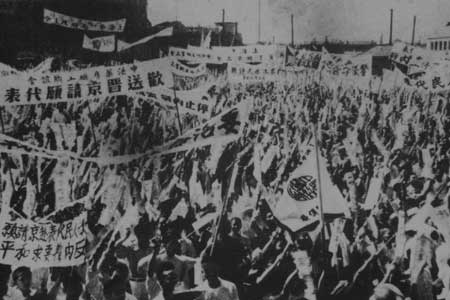 1946年6月,由12个人民团体推选代表组成上海人民呼吁和平入京请愿团,赴南京向国民党政府请愿。图为上海群众欢送请愿团。