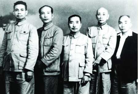 参加中国人民政治协商会议第一届全体会议的致公党体表。从左至右:雷荣珂、黄鼎臣、陈其尤、官文森、严希纯、陈演生(因留守香港总部,未能出席)。